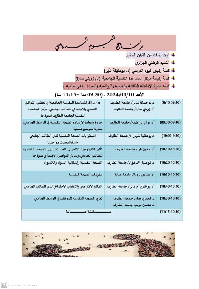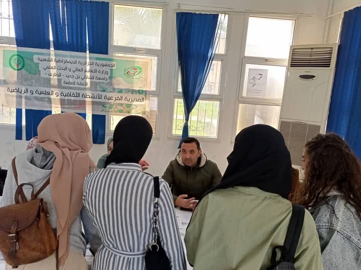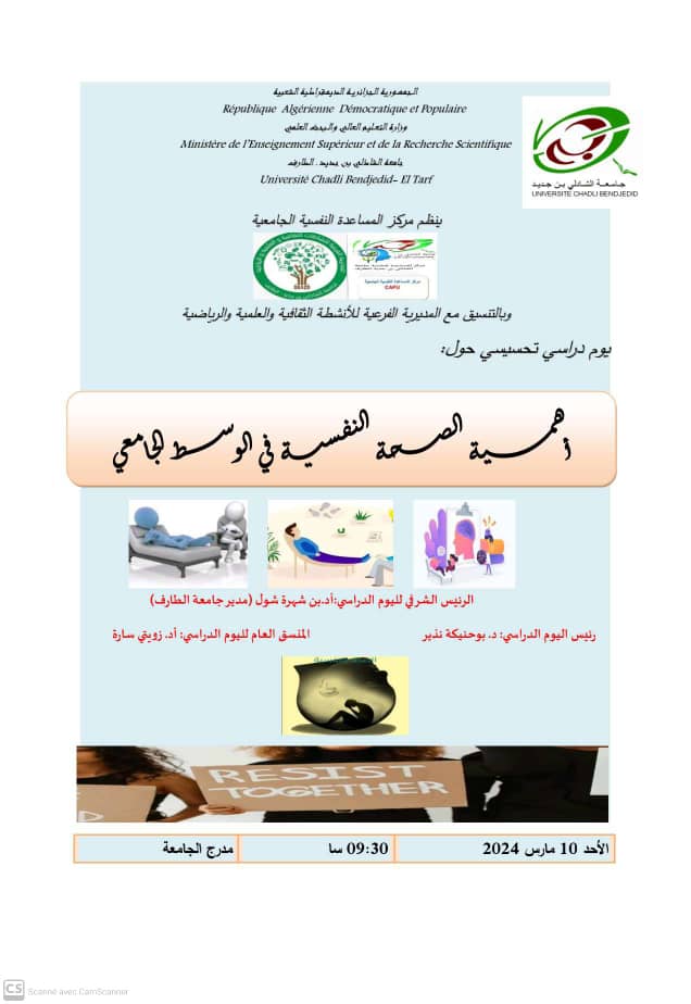 نظم مركز المساعدة النفسية الجامعية يوم 10 مارس 2024 بالتنسيق مع مديرية الأنشطة الثقافية والعلمية والرياضية لجامعة الشاذلي بن جديد يوم تحسيسي حول أهمية الصحة النفسية في الوسط الجامعي.