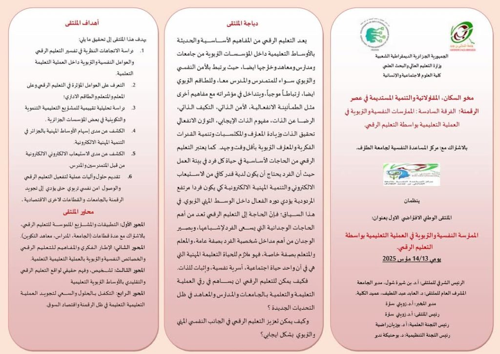 الملتقى الوطني حول الممارسة النفسية والتربوية في العملية التعليمية بواسطة التعليم الرقمي، المنظم من طرف مخبر السكان، المقاولاتية والتنمية المستديمة في عصر الرقمنة يوم 13 مارس 2025 بالاشتراك مع مركز المساعدة النفسية الجامعية