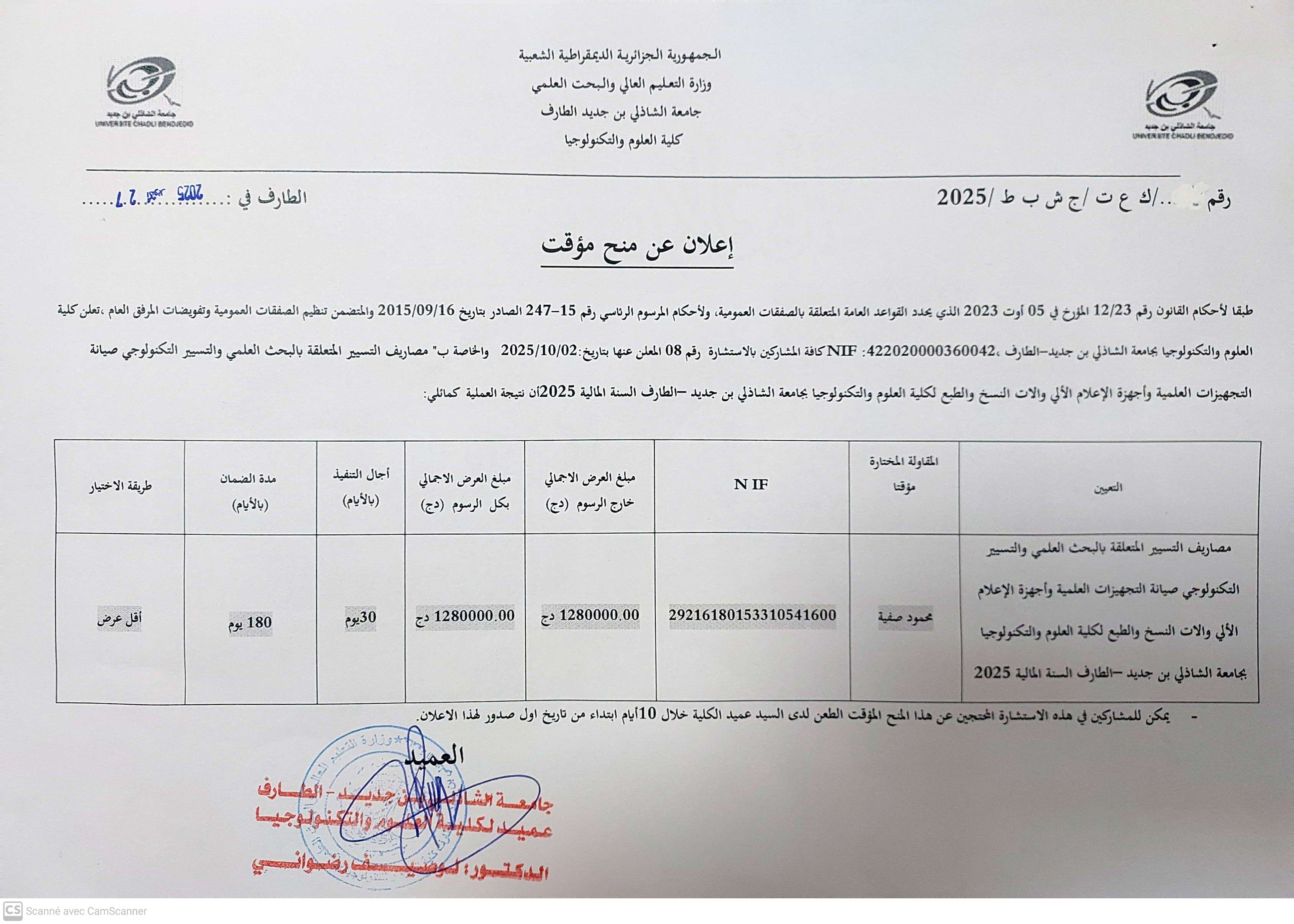 إعلان عن منح مؤقت : للاستشارة رقم 03 / الحصة 01 “مصاريف التكوين و تحسين في الخارج و تسييرهما ( إقتناء تذاكر)” للسنة المالية 2025 . 1 يونيو، 2025