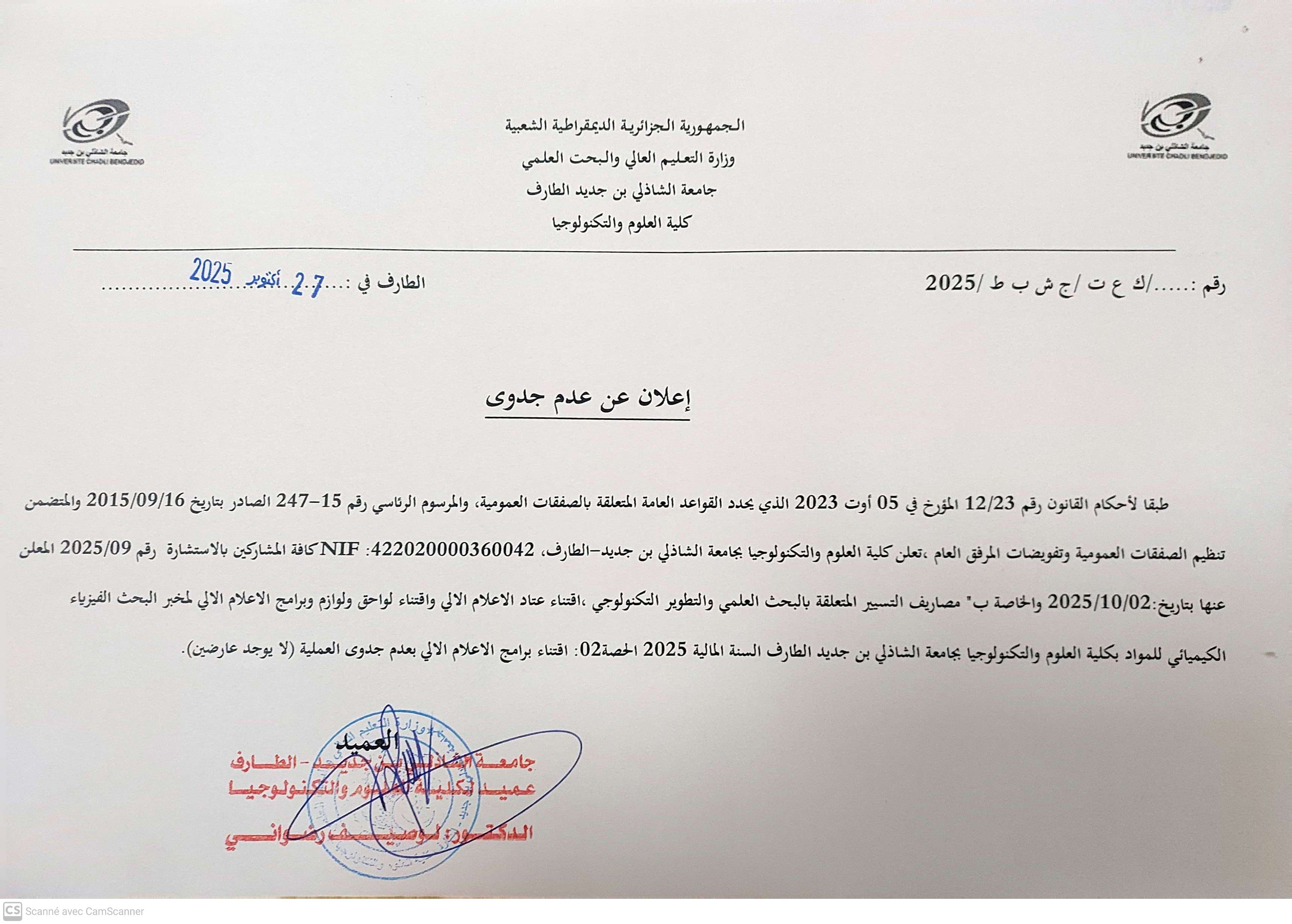 إعلان عن عدم جدوى : استشارة رقم 09 ‘ مصاريف التسيير المتعلقة بالبحث العلمي و التطوير التكنولوجي ، اقتناء عتاد الاعلام الالي و اقتناء لواحق و لوازم و برامج الاعلام الالي لمخبر البحث الفيزياء الكيميائي للمواد – الحصة 02 : اقتناء برامج الاعلام الالي بعدم جدوى العملية ( لا يوجد عارضين)