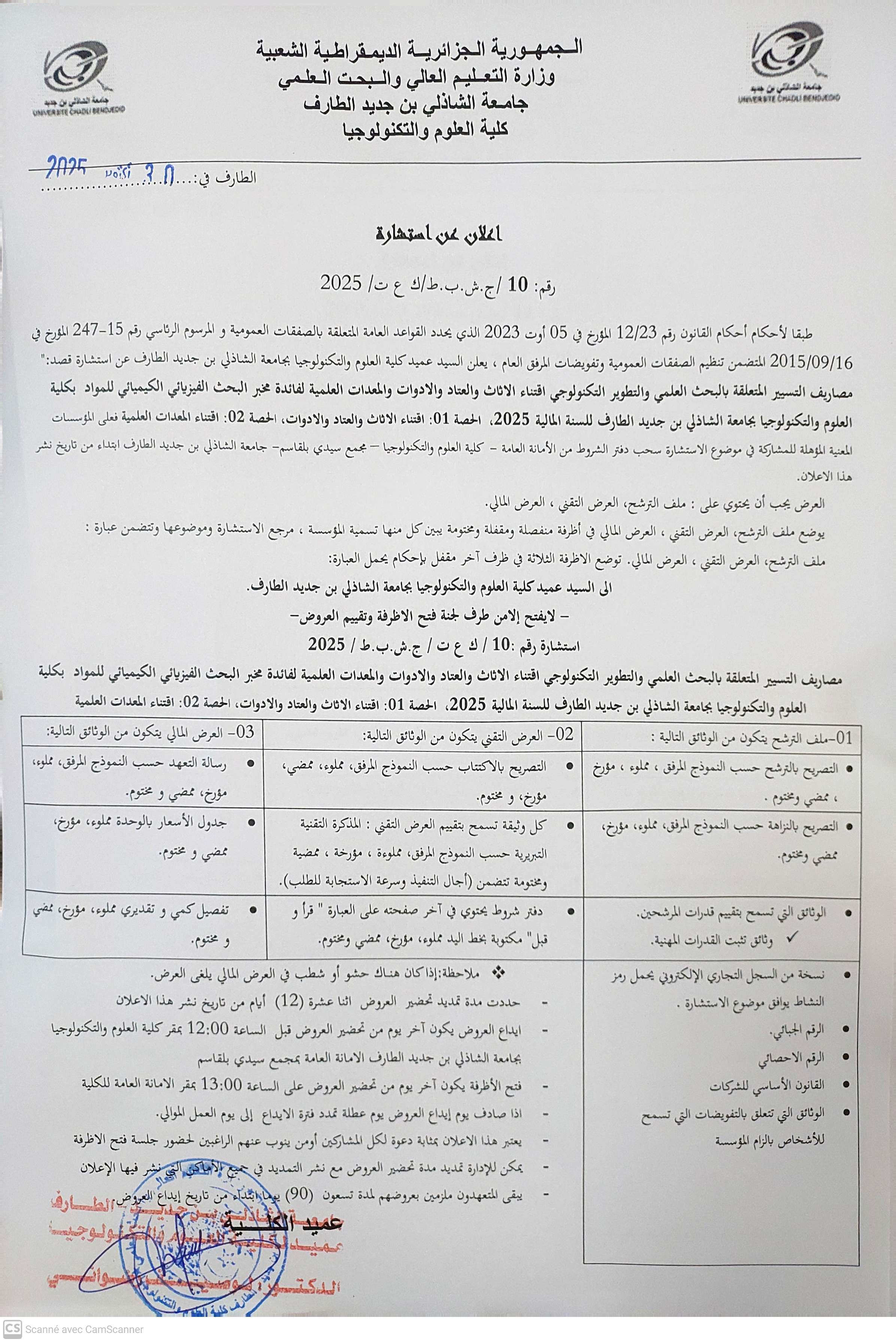 استشارة رقم 10 : مصاريف التسيير المتعلقة بالبحث العلمي و التطوير التكنولوجي اقتناء الاثاث و العتاد و الادوات و المعدات العلمية لفائدة مخبر البحث الفيزيائي الكيميائي للمواد – الحصة 01 : اقتناء الاثاث و العتاد و الادوات – الحصة 02 : اقتناء المعدات العلمية