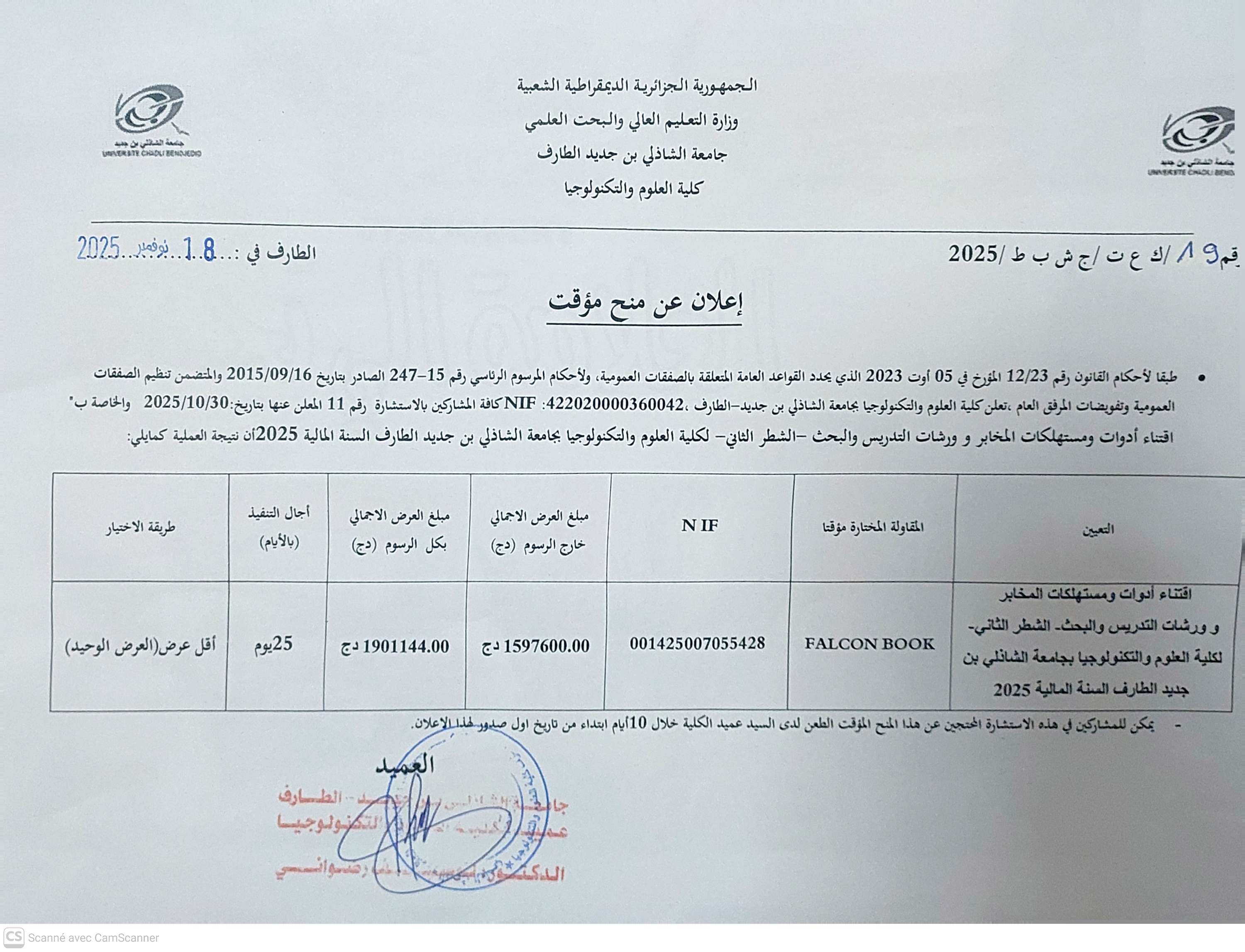 إعلان عن منح مؤقت للاستشارة رقم 11 : “اقتناء أدوات و مستهلكات المخابر وورشات التدريس و البحث – الشطر الثاني “للسنة المالية 2025