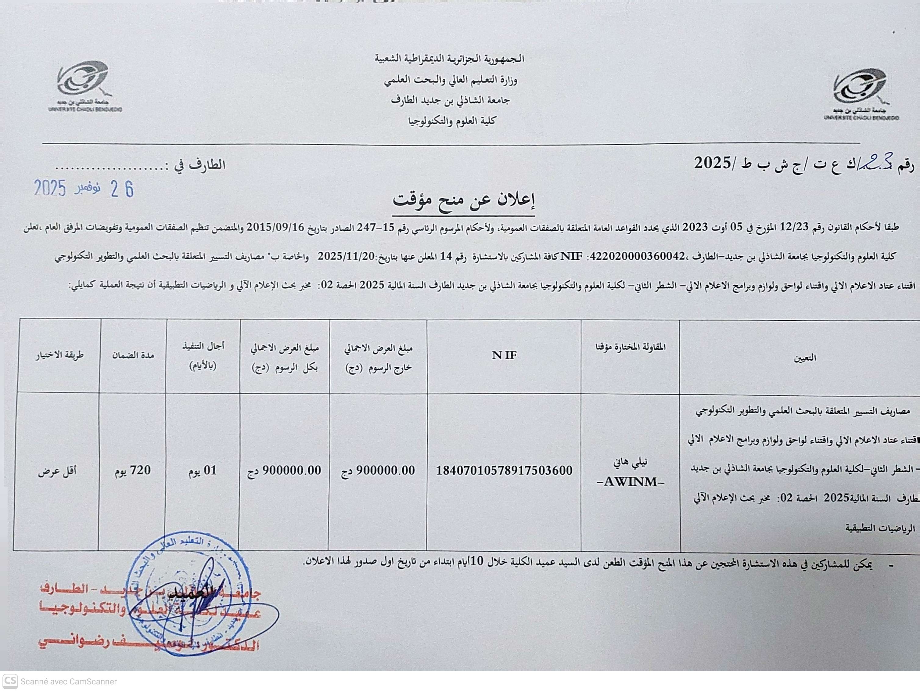 إعلان عن منح مؤقت للاستشارة رقم 14 :”مصاريف التسيير المتعلقة بالبحث العلمي و التطوير التكنولوجي اقتناء عتاد الاعلام الالي و اقتناء لواحق و لوازم و برامج الاعلام الالي – الشطر الثاني – الحصة 02 : مخبر بحث الاعلام الالي و الرياضيات التطبيقية “ Post author:dalel Post published:26 نوفمبر، 2025 Post category:استشارات Post comments:0 Comments You Might Also Like إعلان عن منح مؤقت رقم 17 : ” إقتناء الأوراق و لوازم المكتب – الشطر الثاني “ 25 نوفمبر، 2024 إعلان عن منح مؤقت للاستشارة رقم 02 : “مصاريف نقل الطلبة في الخرجات البيداغوجية لكلية العلوم و التكنولوجيا للسنة المالية 2025” 12 مايو، 2025 اعلان عن منح مؤقت :استشارة رقم 19 – مصاريف نقل الطلبة في الخرجات البيداغوجية لكلية العلوم والتكنولوجيا لسنة 2024 2 سبتمبر، 2024 اترك تعليقاً إلغاء الردCommentEnter your name or username to comment Enter your email address to comment Enter your website URL (optional) احفظ اسمي، بريدي الإلكتروني، والموقع الإلكتروني في هذا المتصفح لاستخدامها المرة المقبلة في تعليقي.