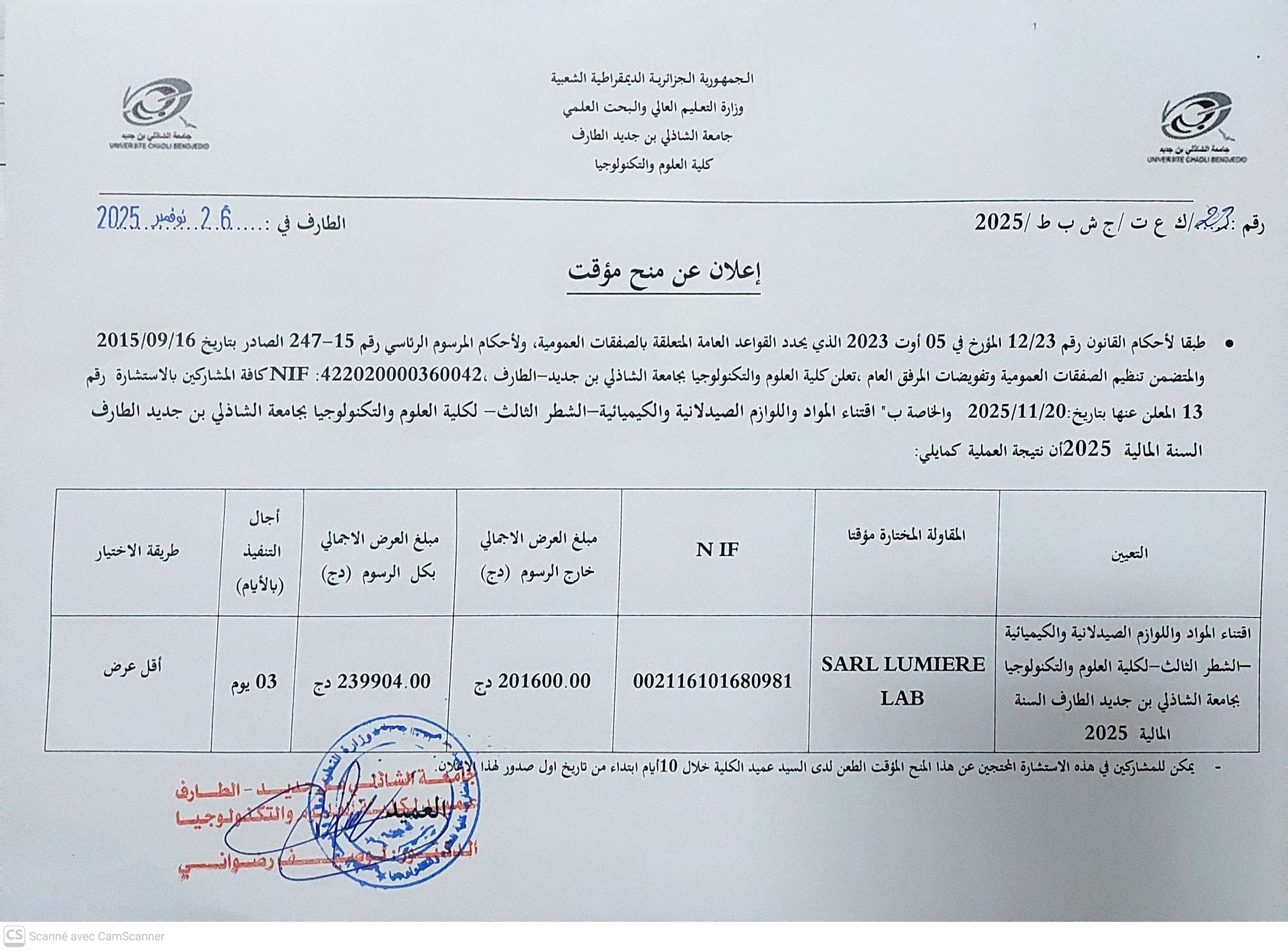 اعلان عن استشارة بعد عدم جدوى رقم 11-2024 اقتناء المواد الكيميائية والصيدلانية لفائدة كلية العلو م والتكنولوجيا للسنة الجامعية 2024/2023