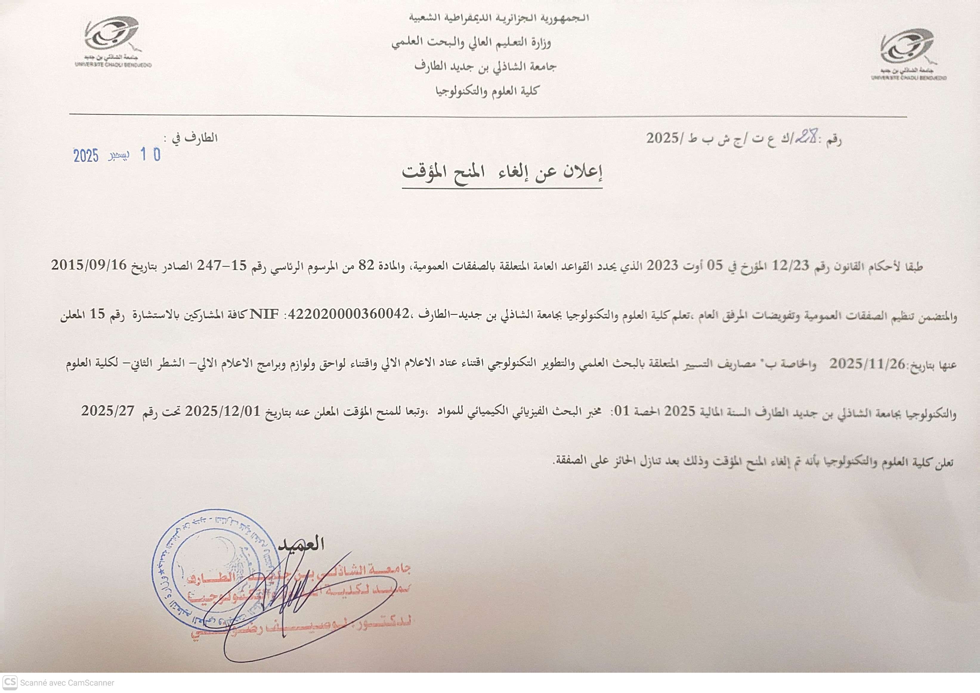 استشارة رقم 10 : مصاريف التسيير المتعلقة بالبحث العلمي و التطوير التكنولوجي اقتناء الاثاث و العتاد و الادوات و المعدات العلمية لفائدة مخبر البحث الفيزيائي الكيميائي للمواد – الحصة 01 : اقتناء الاثاث و العتاد و الادوات – الحصة 02 : اقتناء المعدات العلمية 30 أكتوبر، 2025