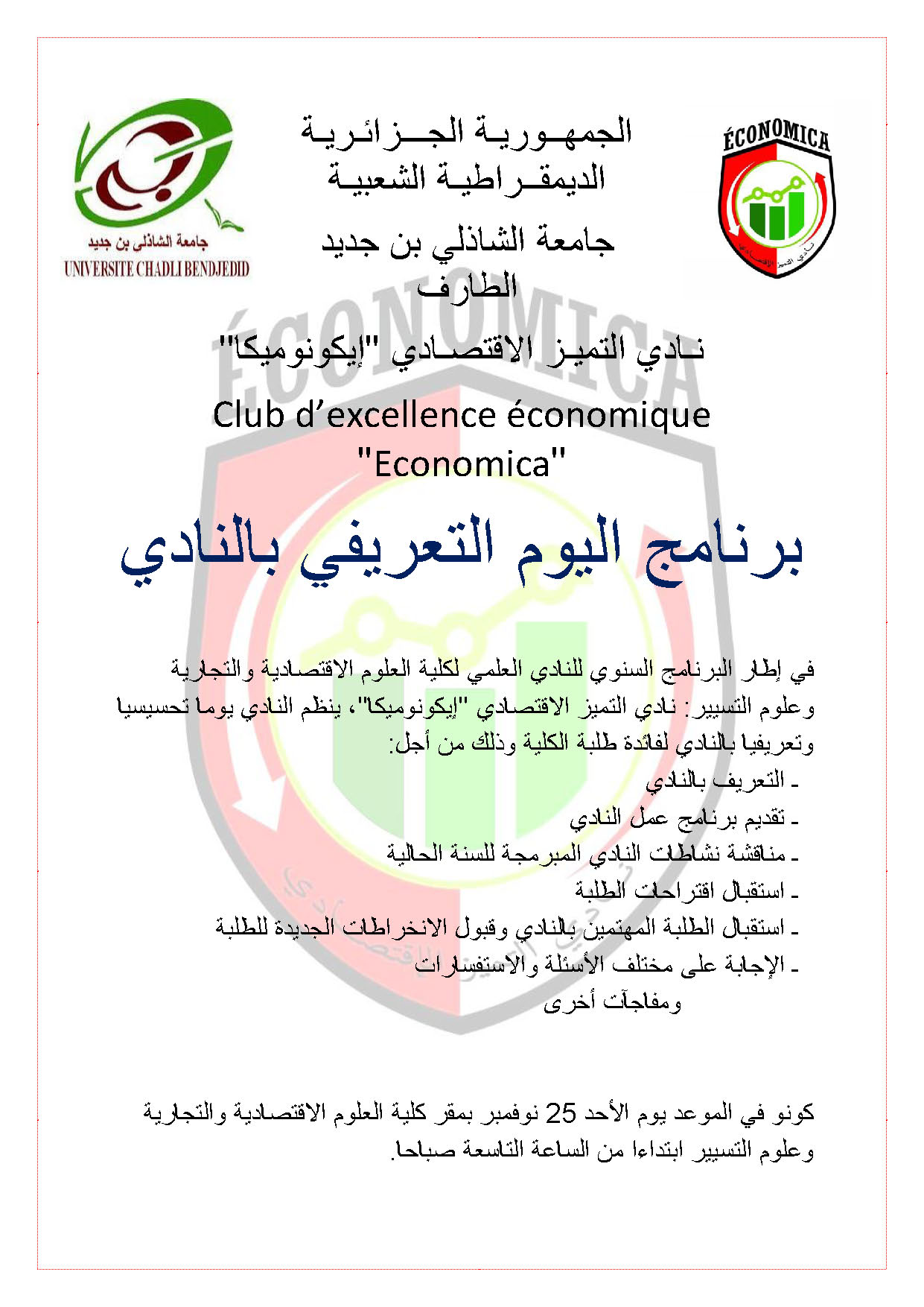 دعوة لحضور اليوم التحسيسي و التعريفي بالنادي العلمي كلية العلوم الاقتصادية والتجارية وعلوم التسيير: نادي التميز الاقتصادي «إيكونوميكا».