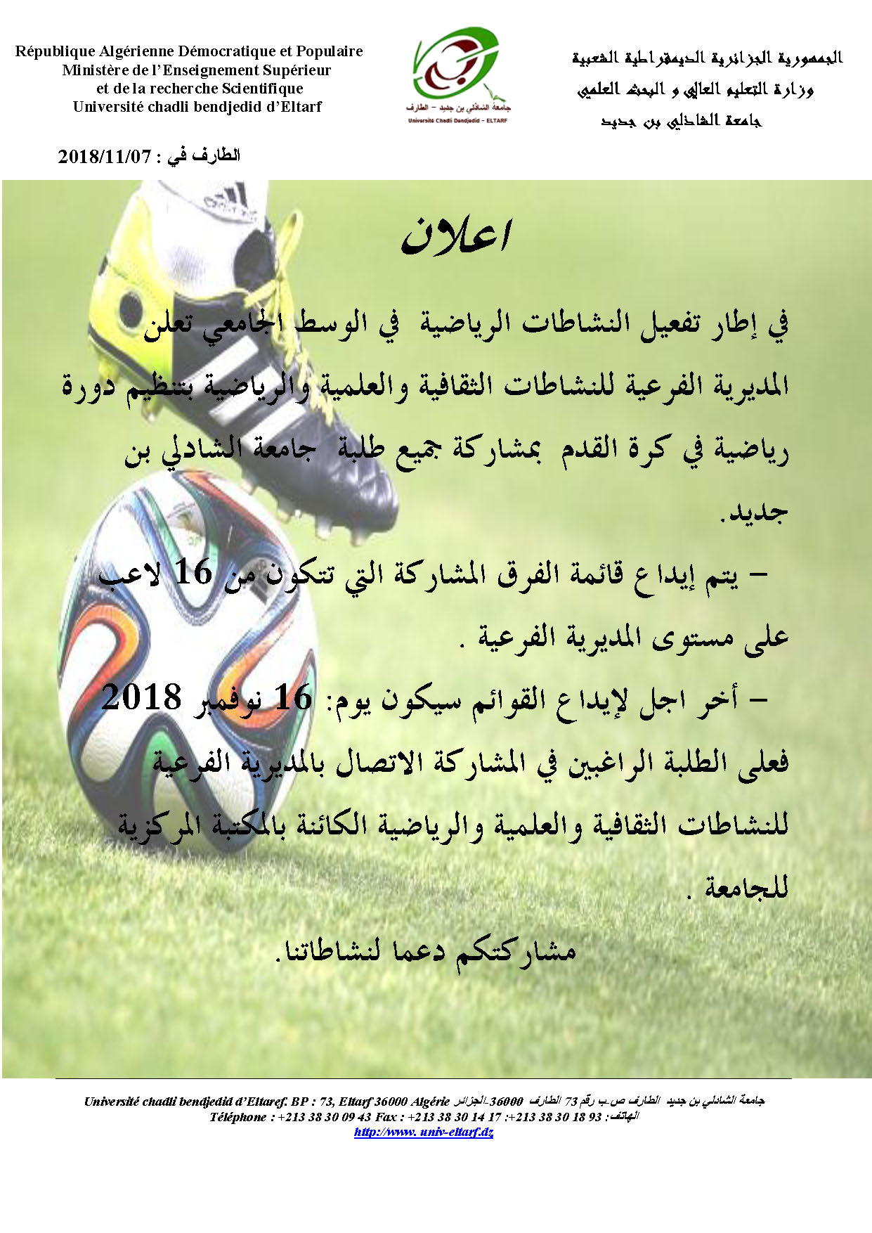 في إطار تفعيل النشاطات الرياضية في الوسط الجامعي تعلن المديرية الفرعية للنشاطات الثقافية و العلمية و الرياضية بتنظيم دورة رياضية في كرة القدم بمشاركة جميع طلبة جامعة الشاذلي بن جديد - الطارف.