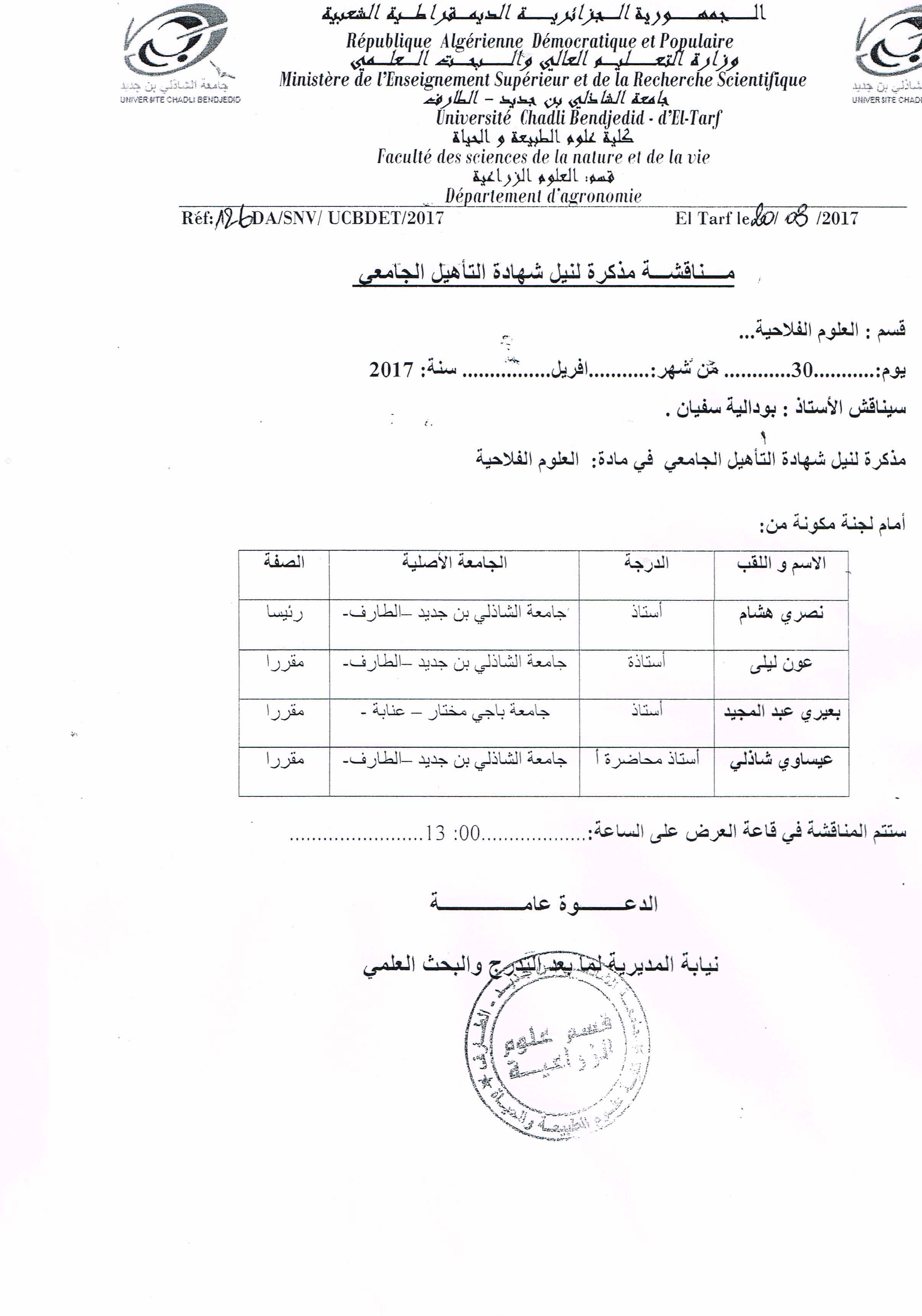 سيناقش الأستاذ : بودالية سفيان مذكرة لنيل شهادة التأهيل الجامعي في مادة الفلاحة بتاريخ 30 أفريل 2017