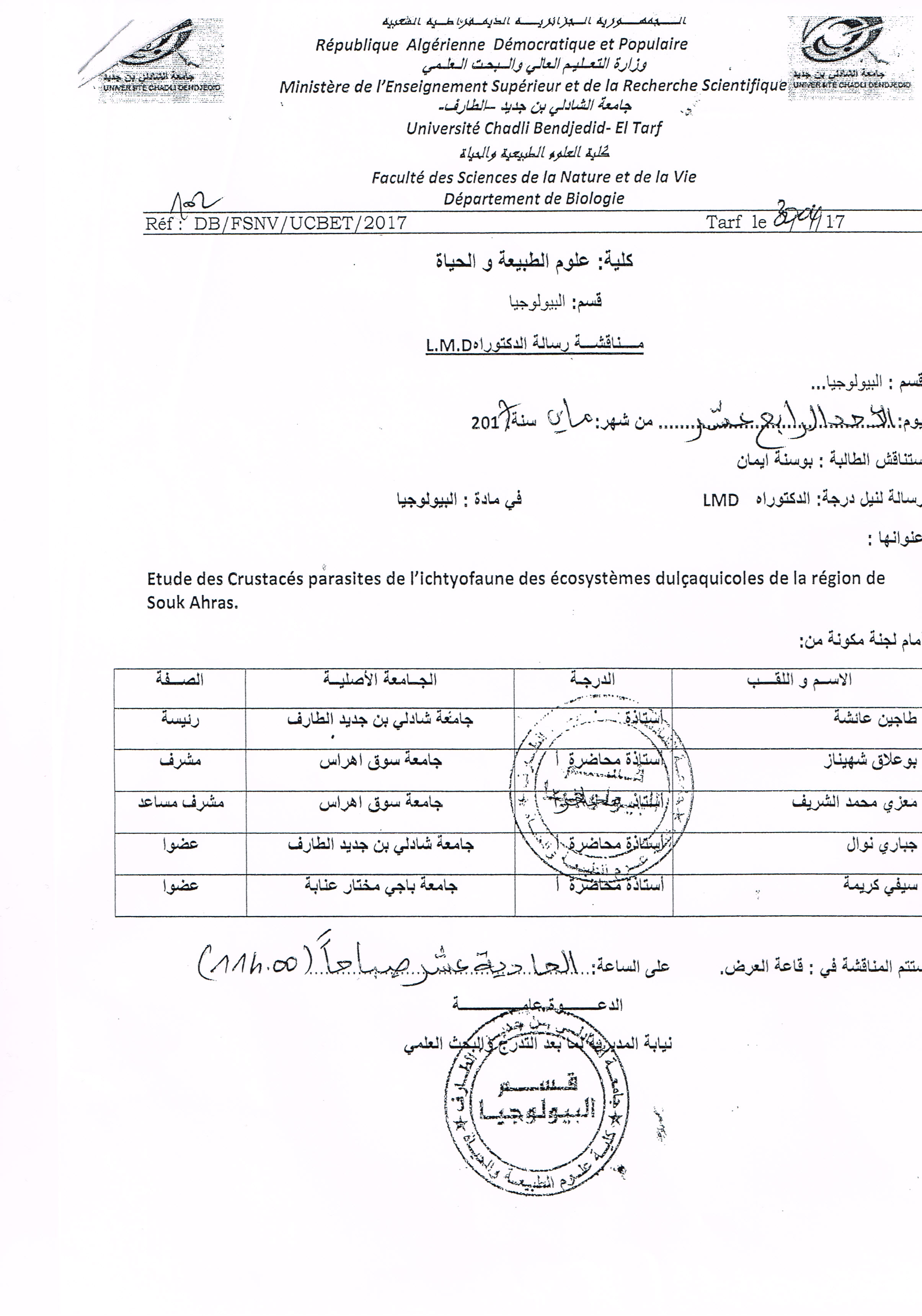 ستناقش : بوسنة إيمان رسالة دكتوراه ل.م.د في مادة البيولوجيا يوم 14 ماي 2017 عنوانها
