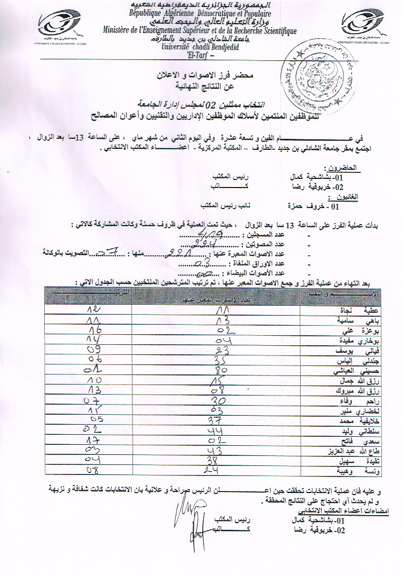 في عام ألفين و تسعة عشرة و في اليوم الثاني من شهر ماي ، على الساعة 13سا بعد الزوال ، إجتمع بمقر جامعة الشاذلي بن جديد - الطارف - المكتبة المركزية - أعضاء المكتب الإنتخابي